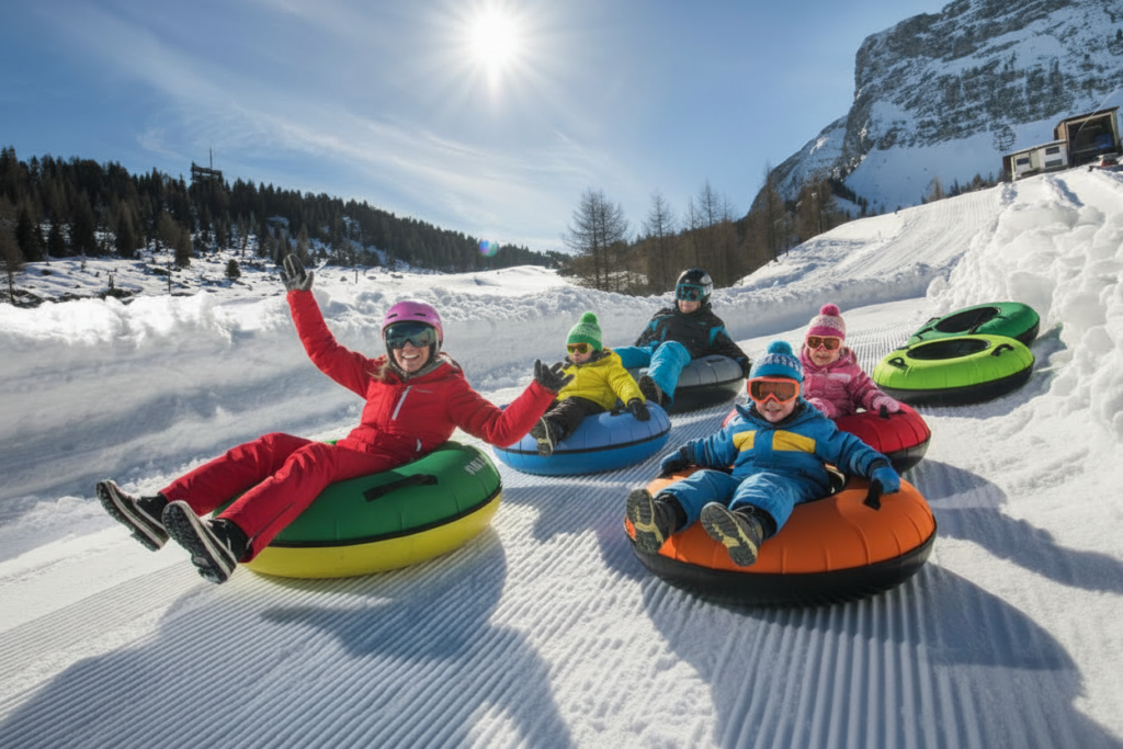 Entre las opciones más divertidas destaca el tubing, una actividad en la que se baja por la nieve sobre flotadores o colchonetas hinchables en los que niños y adultos disfrutan por igual.