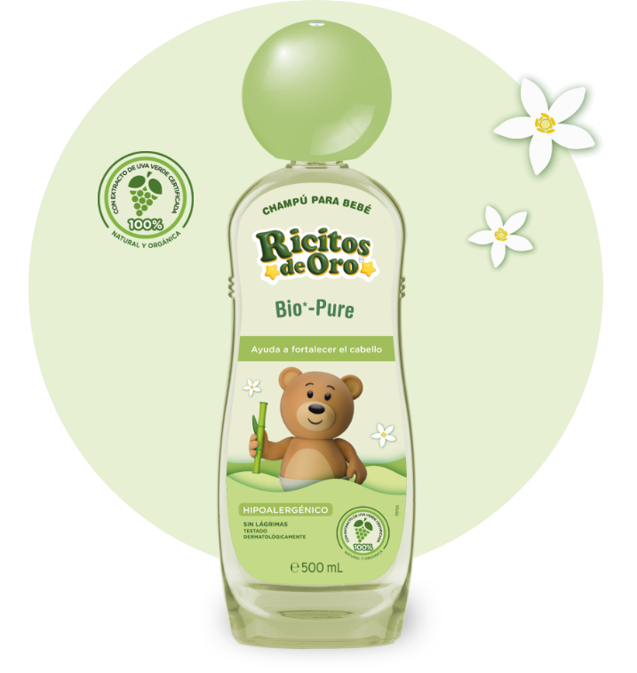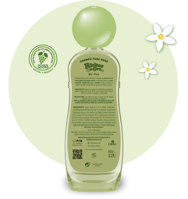 Su fórmula suave e hipoalergénica, elaborada con extracto de uva verde orgánica de origen natural, es ideal para bebés con cuero cabelludo visiblemente seco y sensible, aportándole más brillo y suavidad.